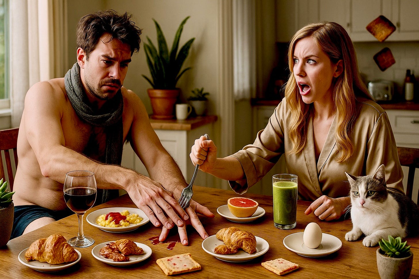 It was 7:14 a.m. on a Tuesday that had the audacity to behave like a Monday. Jack rolled out of bed wearing one sock, a scarf, and nothing else. It was a statement, not a wardrobe. In the kitchen, Diane was already orchestrating breakfast like a caffeinated French general, wielding a spatula in one hand and a raw egg in the other hand.